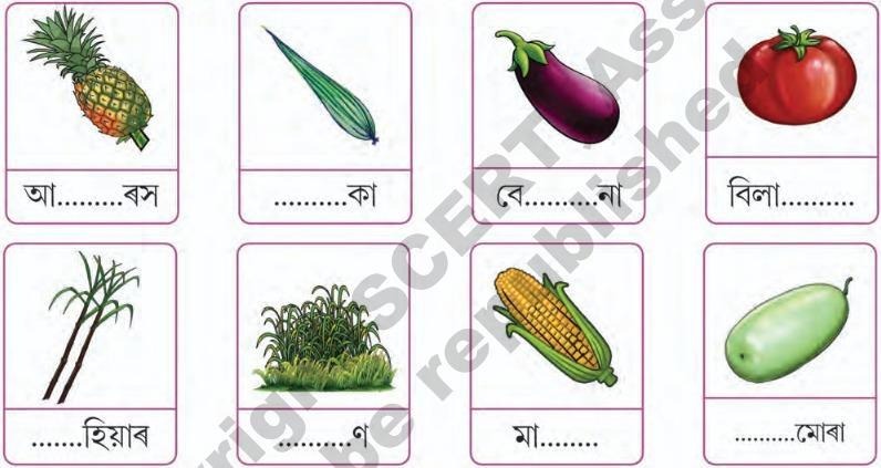 উত্তৰঃ আনাৰস, জিকা, বেঙেনা, বিলাহী, কুঁহিয়াৰ, ধান, মাকৈ,কোমোৰা।