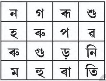 ৬। তলৰ আখৰ-জালৰ পৰা আখৰ বিচাৰি শব্দ গঠন কৰি পঢ়োঁ আৰু লিখোঁ আহা।